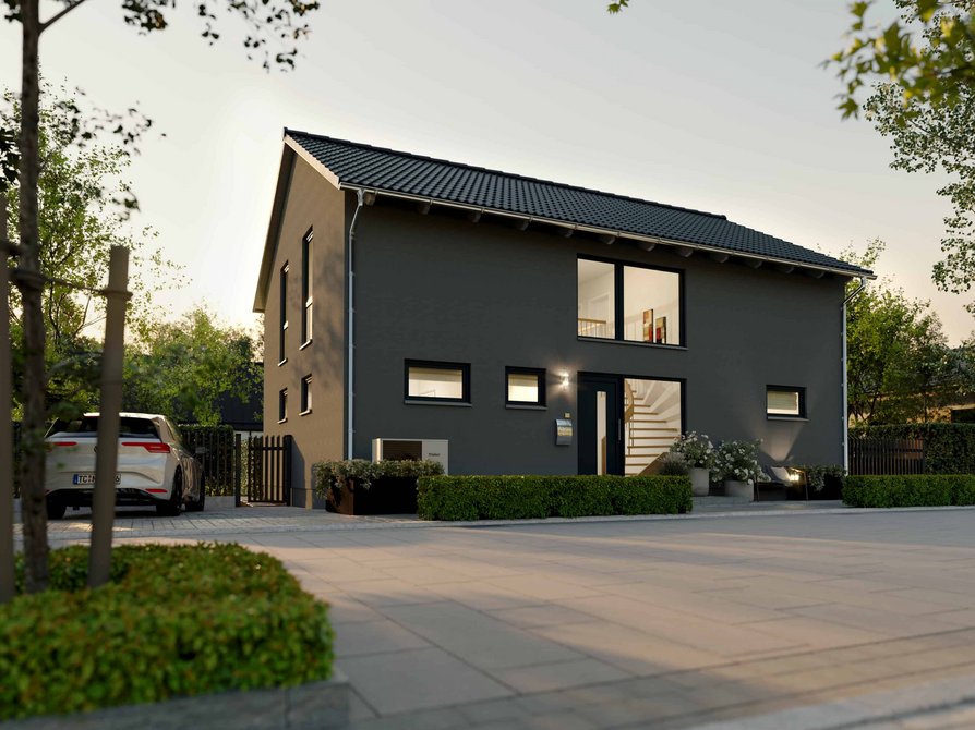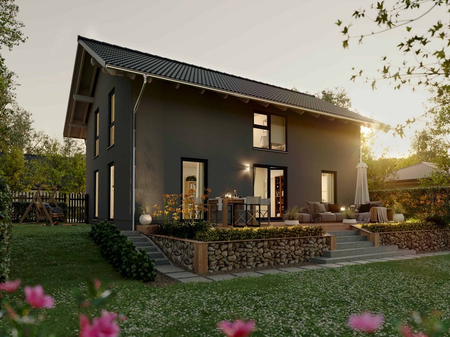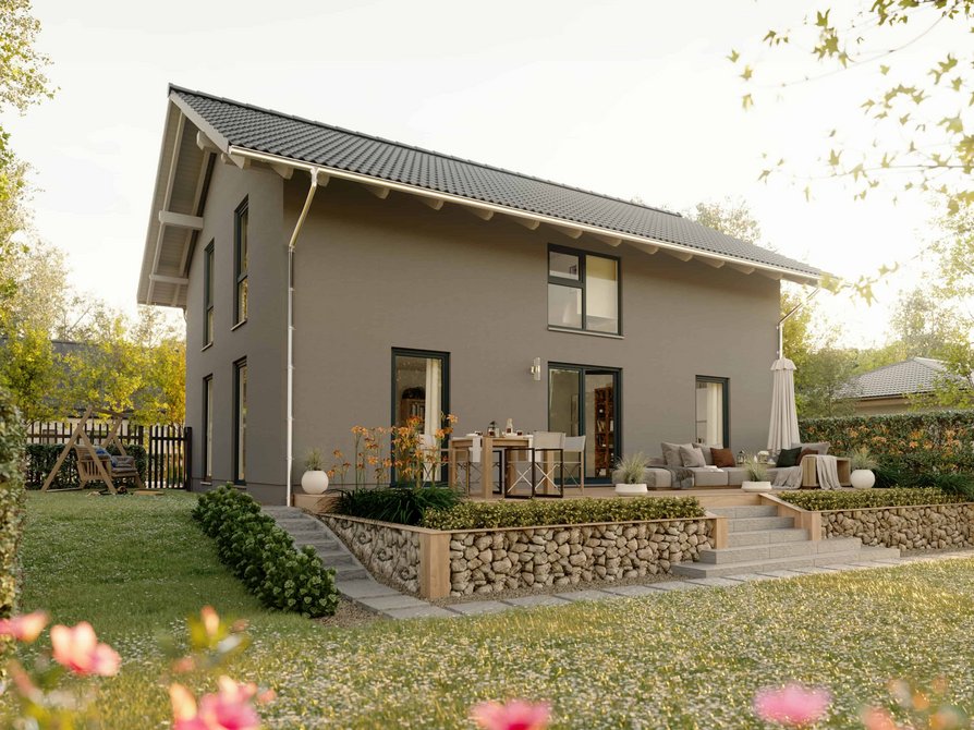 Das Landhaus 142 Modern in der Variante Elegance verbindet klassische Landhausarchitektur mit moderner Großzügigkeit. Große Fensterflächen lassen viel Tageslicht ins Haus und schaffen eine helle Wohnatmosphäre. Der weitläufige Wohn und Essbereich bildet das Herz des Hauses und bietet viel Platz für gemeinsame Zeit mit Familie und Gästen.