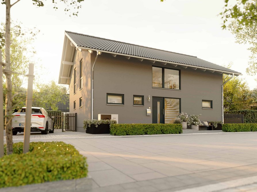 Das Landhaus 142 Modern Süd mit Klinker verbindet eine ausdrucksstarke Dacharchitektur mit einer langlebigen und hochwertigen Klinkerfassade. Der breite Dachüberstand prägt das Erscheinungsbild des Hauses und schützt die Fassade zuverlässig vor Witterungseinflüssen.